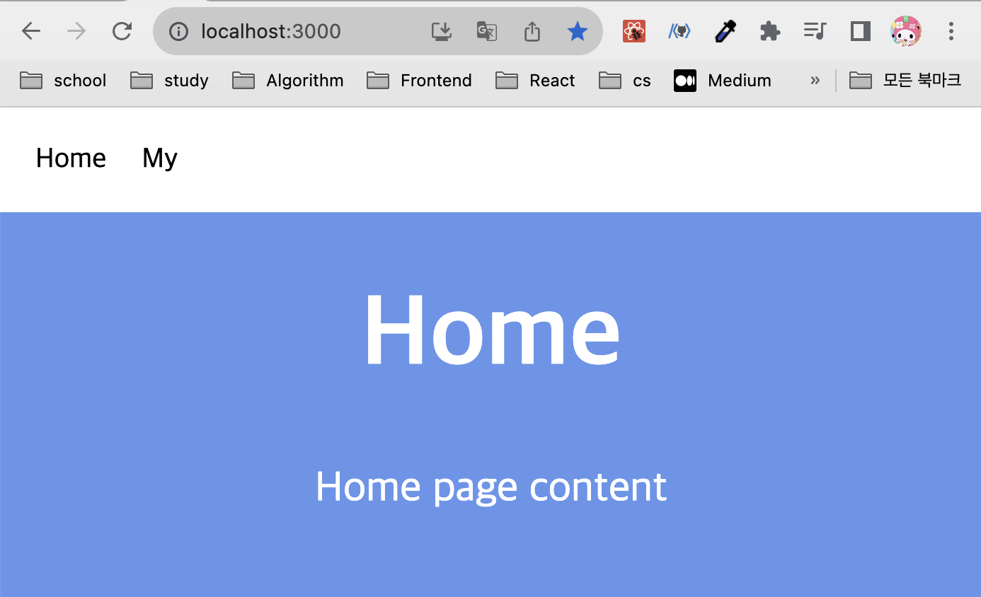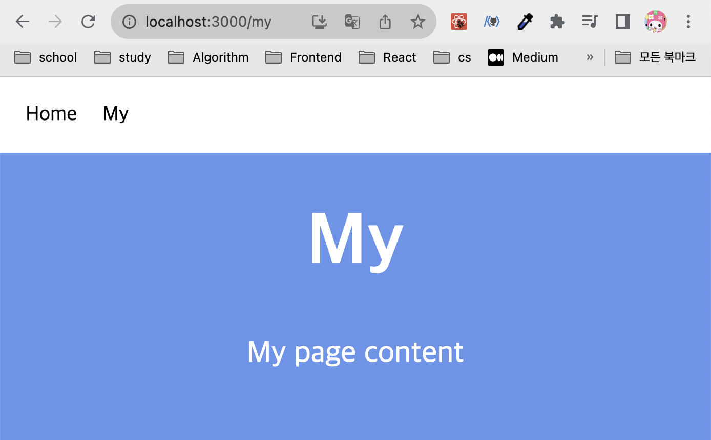 이제 Home을 클릭하면 “/”경로로, My를 클릭하면 “/my” 경로로 Link 컴포넌트를 이용해 잘 이동되는 것을 확인할 수 있다.